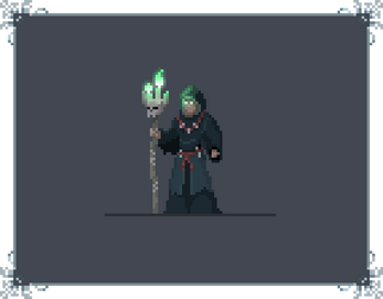 Animations: idle, walk, 2 spell, hit, death.